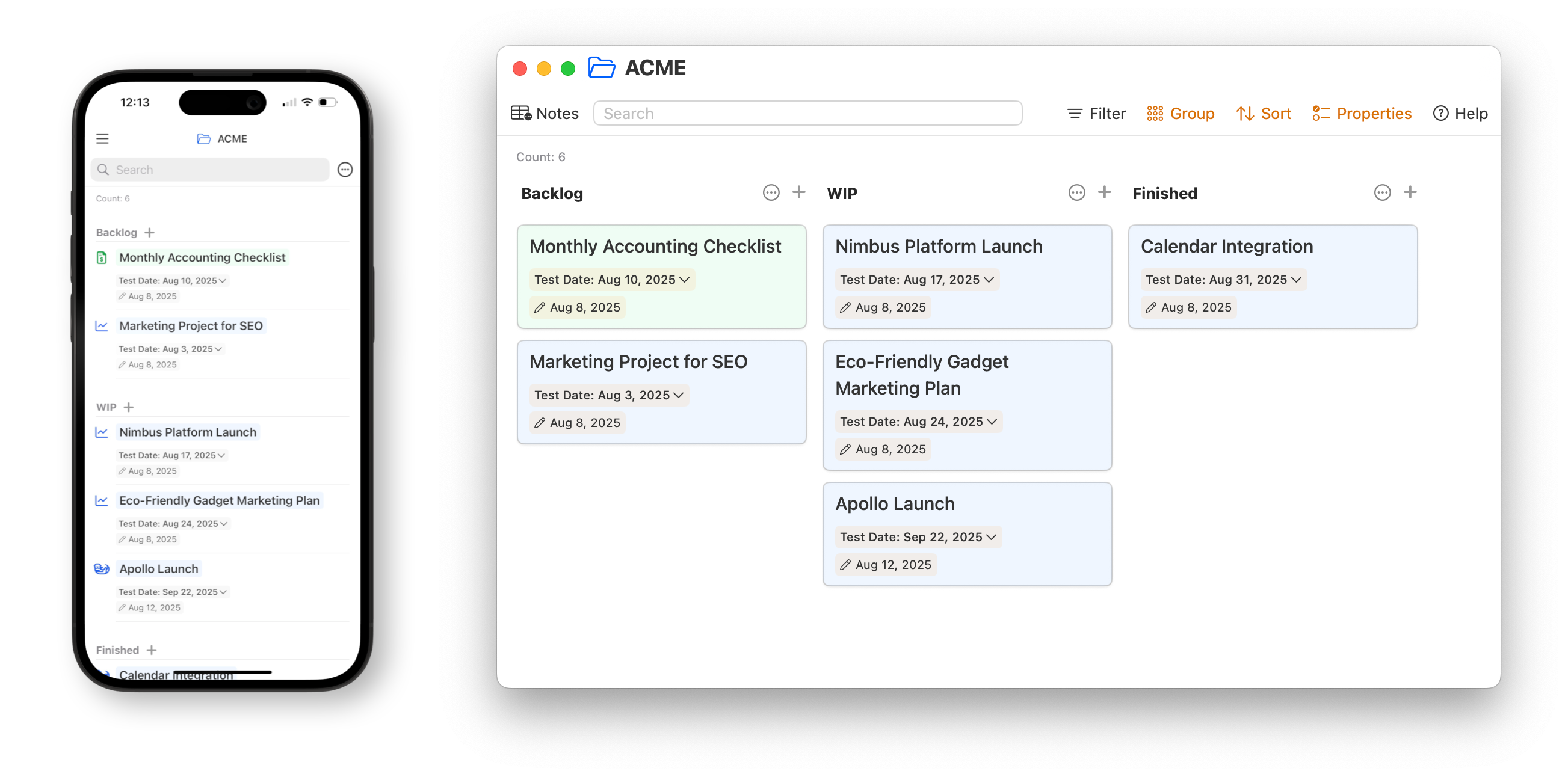 Add note properties to your notes. For project notes, include properties like status, category, and owner, then create a Kanban board to manage them effectively.